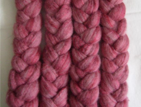 I've always liked the way roving looks, put up in those pretty braids, each one continuous length of roving. So finished. I received one as a gift a few years ago, and looked at how it was done. Yesterday and this morning I braided up the rovings I dyed this summer. And I think I could do a four-strand version as well. I'm afraid it may be addictive.